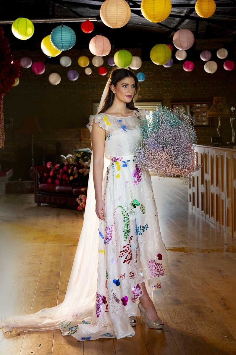 Details: 100% Italian silk organza hand embellished with a kaleidoscope of sequins and beads. The perfect playful top to wear again. Hi-Lo hem skirt with a short train. Worn with an inner bodice top in 100% silk twill with custom built-in bra cups and boning.